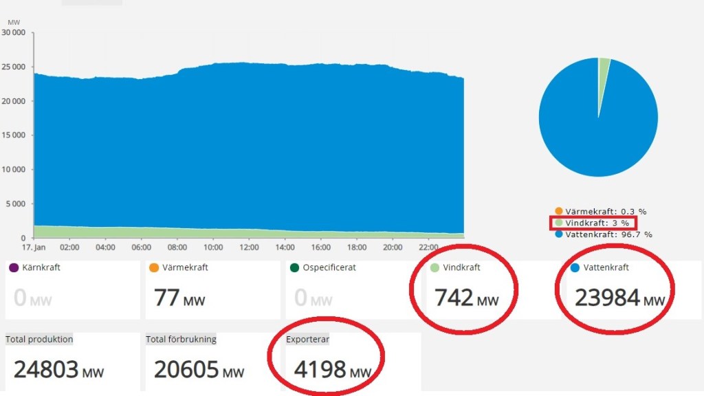Som vi kan se på diagrammet, kommer lite av strømproduksjonen her i landet fra vindindustrien. Dagen da Smånytt var inne for å undersøke, var denne kun på 3% av den totale produksjonen i Norge, men dette varierer noe fra dag til dag. Til sammenligning eksporterte Norge over 5 ganger så mye strøm ut av landet enn det vindindustrien klarer å produsere.