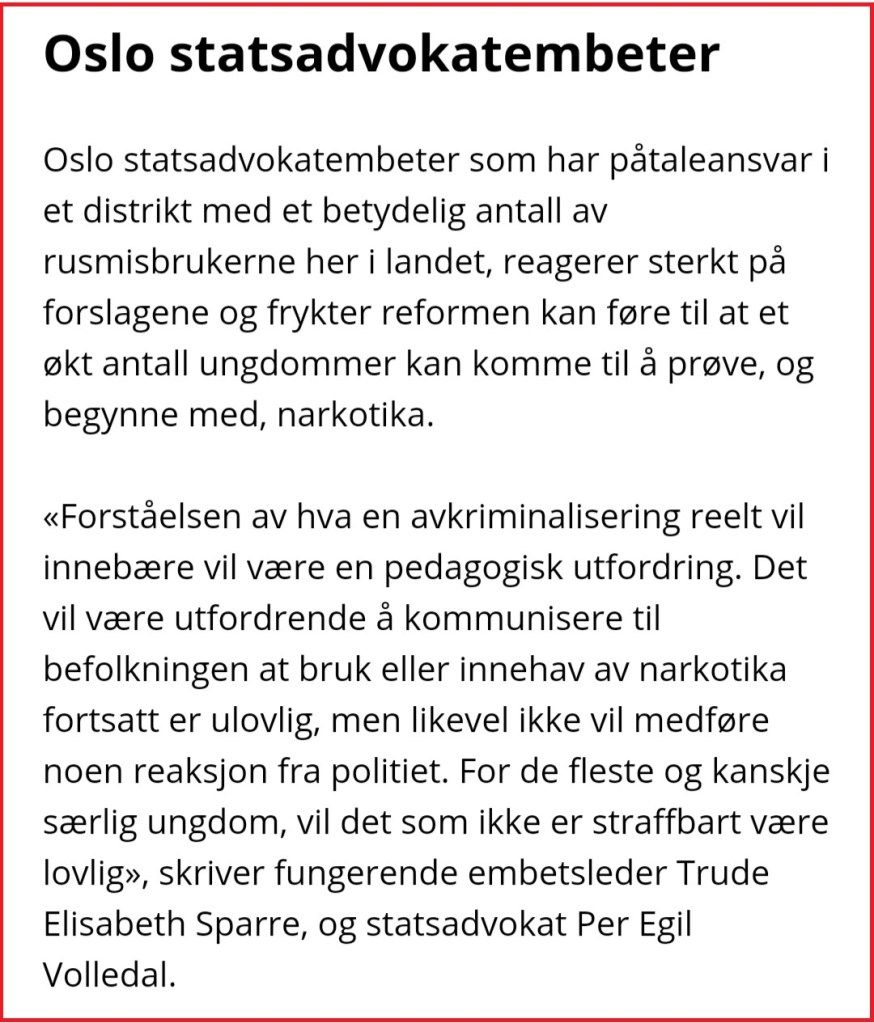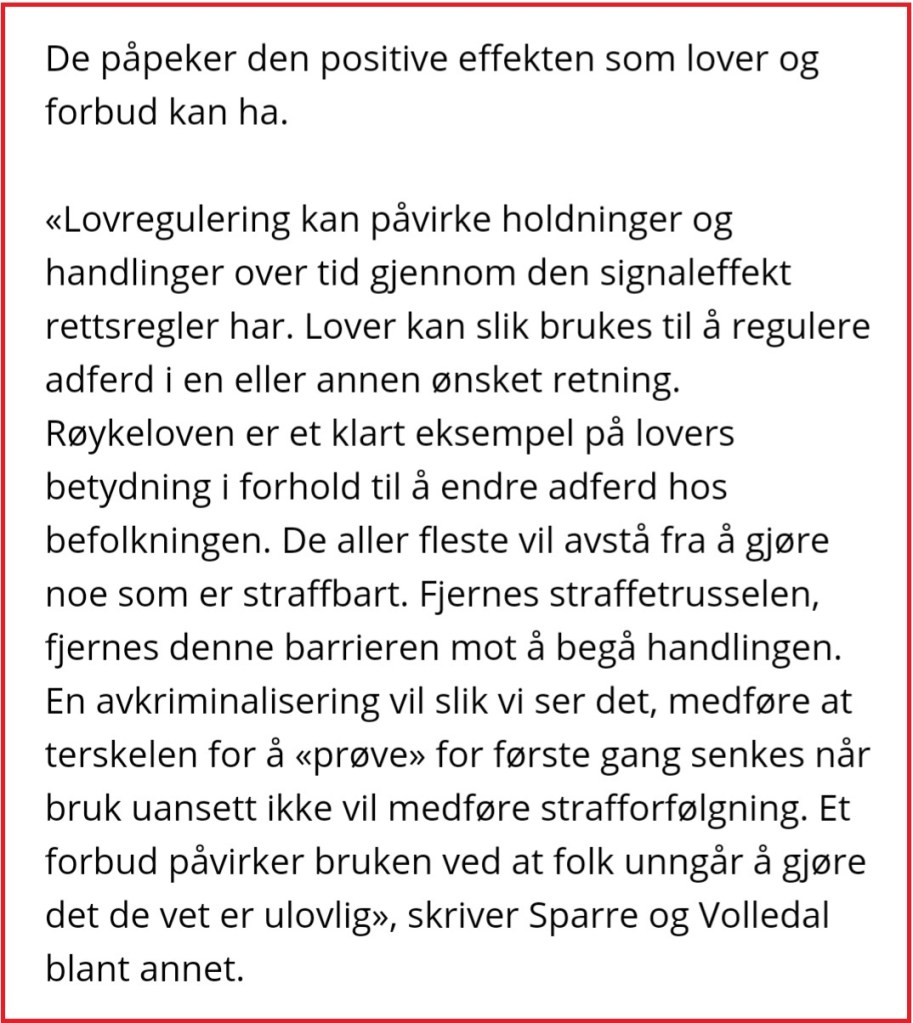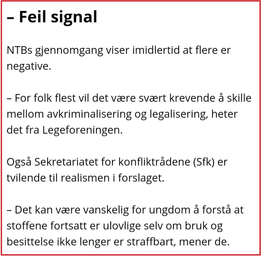 Det vi likevel ikke må glemme, er at ungdomstiden også består av utprøving, å tøye grenser, eksperimentering og lignende. Dette er en naturlig del av det å bli voksen, og kan på mange måter være sundt og positivt på mange områder, men langt fra alltid. Det er her faren ved å avkriminalisere narkotikabruk etter min mening kommer inn.