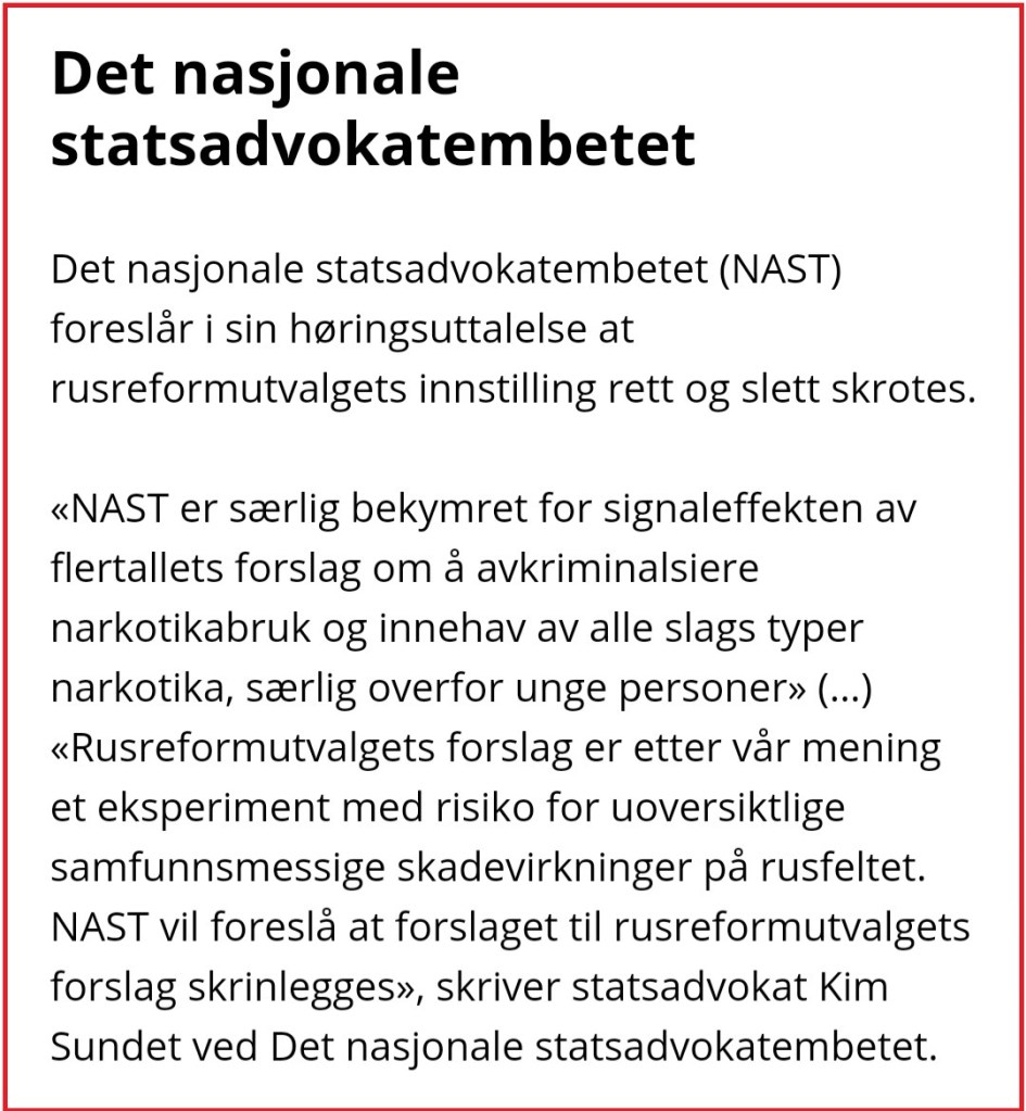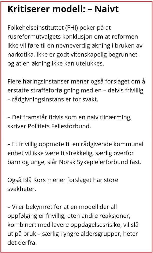 Når det gjelder barn og unge, bommer rusreformen totalt. Argumentene for dette har jeg utdypet i innlegget. Ved å avkriminalisere narkotika for barn og unge som prøver ut narkotika, gis det signaler som kan tolkes som at narkotika ikke er så farlig. Dette vil etter min mening senke terskelen for de som står i fare for å prøve ut ulovlige stoffer som igjen vil føre til økt bruk blant barn og unge. En undersøkelse gjennomført av Actis (2019) svarer 70% (1008 resp) at de tror flere vil prøve ulovlige rusmidler dersom det ikke gis en reaksjon. Det er akkurat det jeg fryktet alle mest.