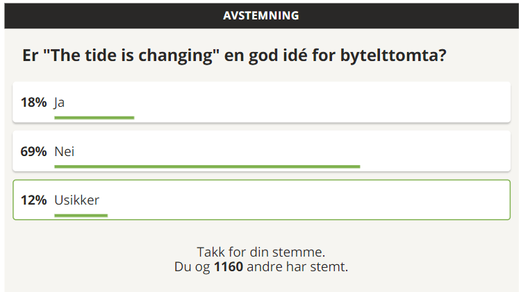 I en spørreundersøkelse på Dalane Tidendes nettavis bes leserne ta stilling til følgende spørsmål: Er «The tide is changing» en god idé for bytelttomta (les; Jernbanekaien)? I skrivende stund har 1.160 personer svart. Resultatet er at kun 18 % mener at det er en god idé, 12% er usikre mens hele 69 % svarer nei på spørsmålet. Dette viser også at det er stor motstand mot å plassere kunstprosjektet på Jernbanekaien.