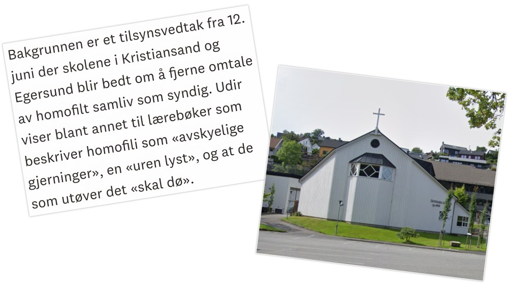 De siste ukene har debatten om kristne privatskoler og deres undervisning om homofilt samliv igjen blusset opp. Samfundets skole her i Egersund får kritikk fra Utdanningsdirektoratet (Udir) for blant annet å bruke lærebøker der homofili omtales som syndig, urent og avskyelig, noen steder med bibelsitater som sier at «de som utøver dette skal dø».