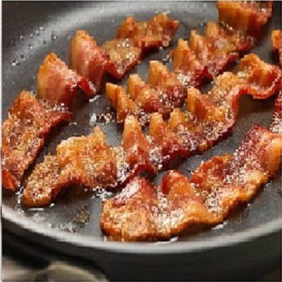 Så steker du bacon på pannen. Andre ting som også kan brukes, er pølsebiter eller skinkebiter, men bacon er nå best 😉