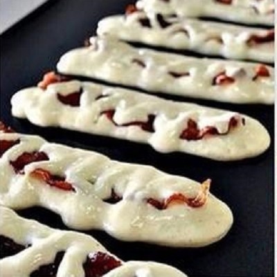 Så finner du fram en langpanne som du smører eller bruker bakepapir i. Der klatter du først porsjoner med pannekakerøre i ovale former på brettet. Så legger du på en baconskive, for deretter å etterfylle mer røre.